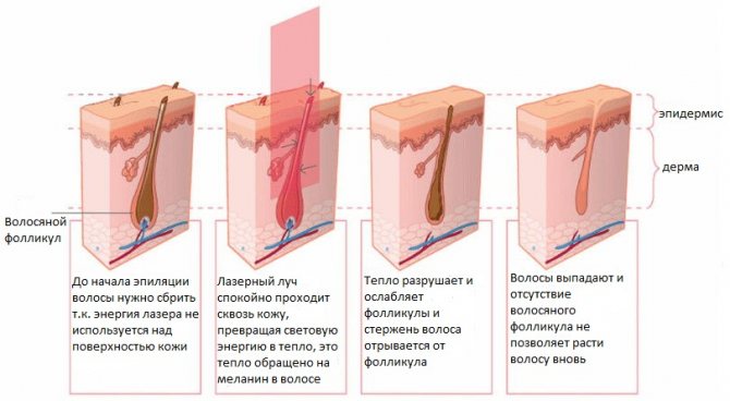 Лазерная эпиляция – это воздействие светового импульса на меланин, содержащийся в волосе, окрашивающий его в более темный, чем окружающие ткани организма, цвет. Длительность каждой процедуры, их количество, интенсивность болезненных ощущений зависят от индивидуальных особенностей: