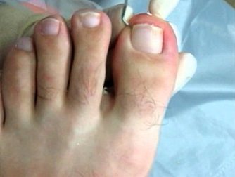 Чаще всего врастает ноготь на большом пальце стопы. Боковая часть ногтевой пластины «врезается» в околоногтевой валик и продолжает свой рост внутрь него. При этом возникает боль, припухлость, валик становится красным и горячим на ощупь.