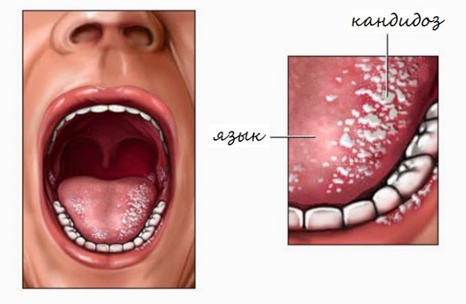 На ранних стадиях человек обращает внимание на возникновение очагов у основания языка, которые позже сливаются в единое пятно, образуя плотный творожистый налет.