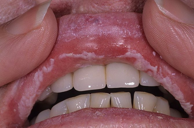 Красный плоский лишай – заболевание кожного покрова и слизистых. Имеет невыясненную этиологию. При возникновении точек белого цвета в ротовой полости поражает преимущественно красную кайму губ и язык. У большинства пациентов болезнь проявляется молочными папулами с шероховатой поверхностью. Между собой образования соединяются мостиками. Человек жалуется на боль во время приема пищи, ощущается жжение, сухость.