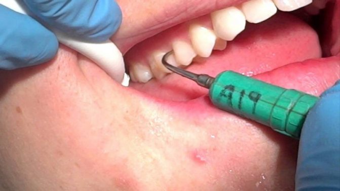 - Как только подействует анестетик, врач, отступив от ножки нароста 1-2 мм, надрезает вокруг него мягкие ткани десны на всю их глубину, захватывая надкостницу.