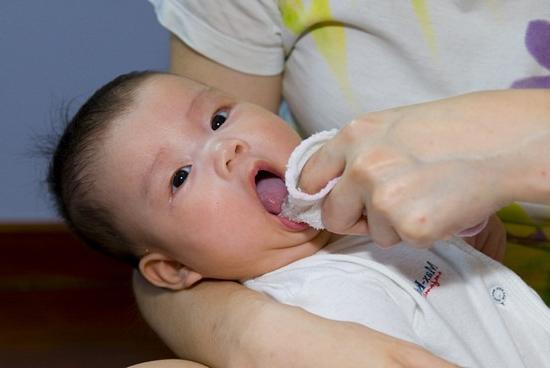 Чистка языка малыша с помощью стерильного бинта, смоченного в содовом растворе
