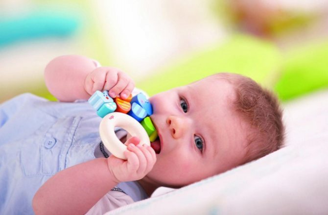 - Когда режутся зубки, малышу для снижения зуда и воспалительного процесса десен нужно давать кусать детский “прорезыватель” – игрушку из силикона.