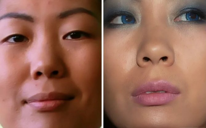 У женщин, имеющих азиатский тип внешности, разрез глаз сильно отличается от европейского типа, именно поэтому нужен особый подход в нанесении макияжа. С помощью декоративной косметики можно визуально раскрыть и расширить глаза. При этом ресницы необходимо удлинить, используя тушь, либо же нарастить искусственные.