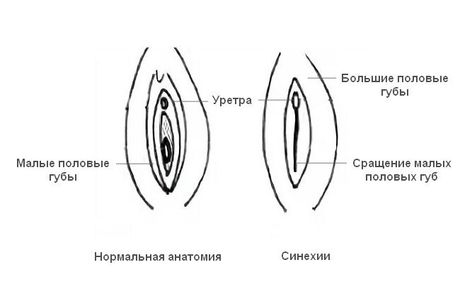 Нужно упомянуть еще один повод посетить врача: это синехии, или срастание малых половых губ. Такое случается из-за низкого уровня гормона эстрогена, из-за которого слизистая гениталий ребенка пересушена. Она легче травмируется, подвержена воспалениям. Кроме того, к образованию спаек приводит недостаточная или слишком частая гигиена девочек до года. Симптомы проблемы: