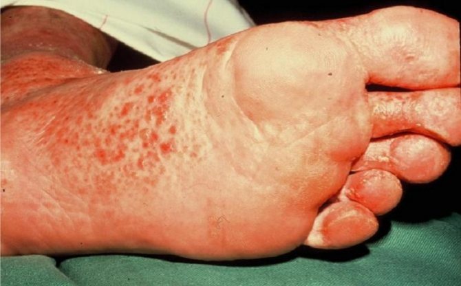- Гиперкератотическая форма. Появление бляшек сине-красного цвета (папул), которые располагаются на сводах стоп. Отмечается сухость кожи, умеренная боль и зуд.