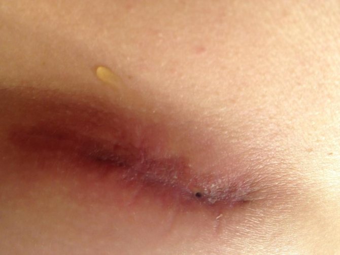 - свищ от лигатуры (нити для шва) – появление уплотнения на шве, из которого сочится гной, рядом кожа краснеет, теплее на ощупь, чем окружающая, возникает из-за инфицирования шовного материала, аллергической реакции на него;