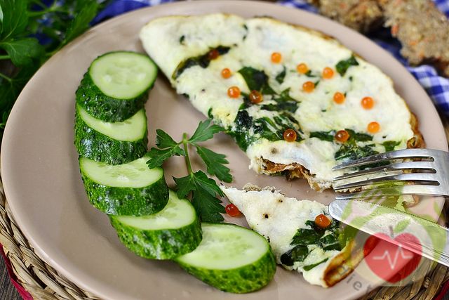 Омлет получается пышным и мягким. При подаче обильно посыпьте свежей зеленью.