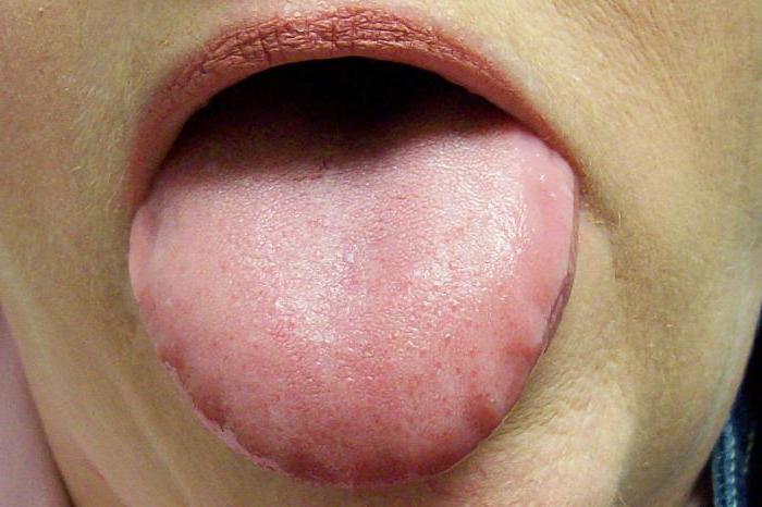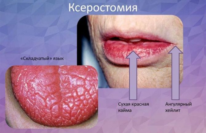 Нарушение проявляется в форме неполноценного слюноотделения, что провоцирует постоянную сухость в ротовой полости. Патология сопровождается отёчностью, образованием трещин на тканях языка, появлением его малинового окраса и зубных отпечатков.