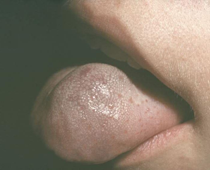 При этом воспалительном заболевании на языке образуются характерные отверстия. Также одним из распространенных симптомов этой болезни является сглаживание сосочков. Язык приобретает гладкую блестящую поверхность. Также заболевание сопровождается отеками органа, болезненными ощущениями. Иногда могут образовываться пятна или неприятный запах.