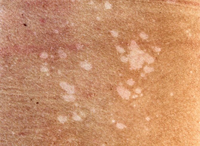 Разноцветный лишай дает высыпания в виде коричневых пятен неправильной формы, они не возвышаются над уровнем кожи. Реже пятна могут быть телесного или розового цвета.