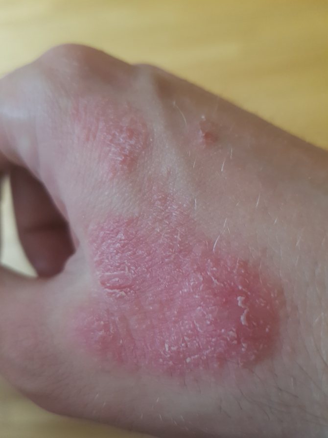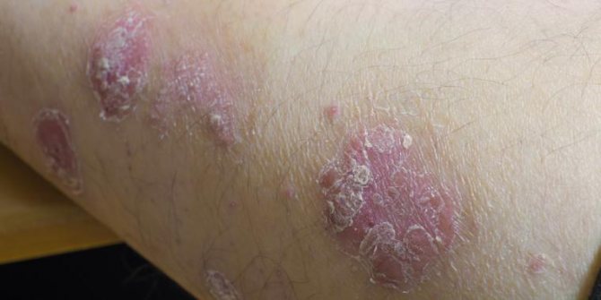 Хроническое аутоиммунное заболевание, характеризующееся чередованием стадий обострения и ремиссии. Красные пятна часто образуются в области коленей и локтей, напоминают выступающие ороговевшие бляшки, сильно шелушатся, покрываются белыми хлопьями.